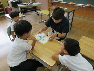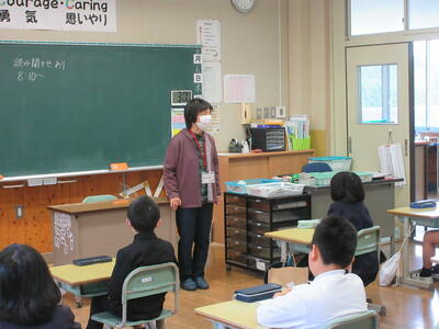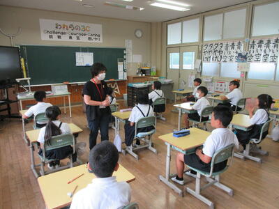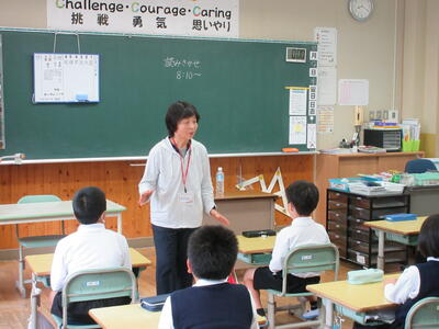 岡山県スポーツ協会主催の「晴れの国トップアスリート派遣事業」に申請し、岡山県プロスポーツクラブ『トライフープ岡山』から中・高校生教室のコーチの方に来ていただきました。小学生にわかりやすく、また、おもしろく説明をしてくださり、子どもたちも楽しくアップしたり、ペアドリルをしたりしました。