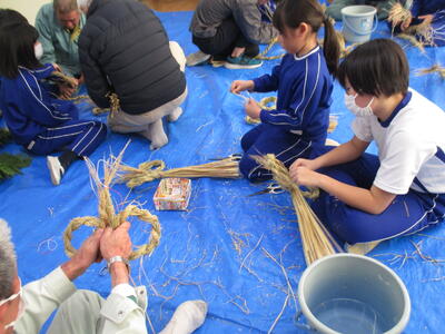 12月12日(金)、3・4年生は、ボランティアの方に教えていただきながらしめ縄作りに挑戦しました。ほとんどの児童が初めてのしめ縄づくりということもあり、苦戦していましたが、ボランティアの方の手を借りて丁寧に編み上げていきました。最後には、立派なめがね飾りが完成しました。地域の伝統文化に触れるとともに、ボランティアの方との交流を深める貴重な機会となりました。ありがとうございました。