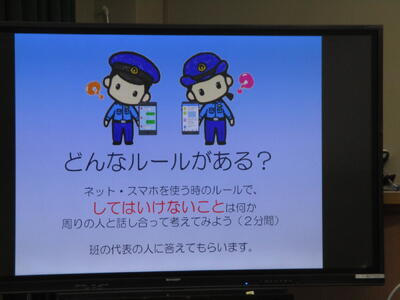 警察の方は、「SNSでは悪口、暴言は書かない」「スマホ依存症にならないように」「一度ネットに流れた情報は消すことができない。送信ボタンを押す前に一度立ち止まって考えてほしい」など、強く呼びかけられました。子どもたちは、真剣な表情で話を聞き、インターネットやスマホの付き合い方について学びました。
